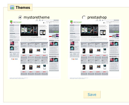 - Cada tema tiene su propio archivo de imagen preview.jpg en su carpeta, permitiendo al propietario de la tienda observar la manera como luce el tema directamente desde el back office, y seleccionar el tema apropiado.